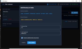 - Directory management — add any local folder or external drive to the index, with recursive or top-level-only options. Quick-add buttons for common locations (Home, Documents, Downloads, etc.) and auto-detected drives/volumes
