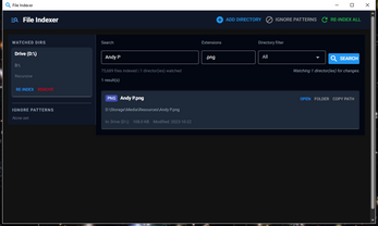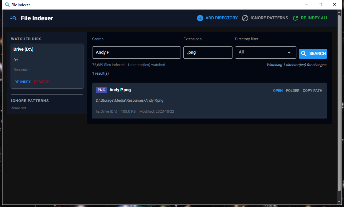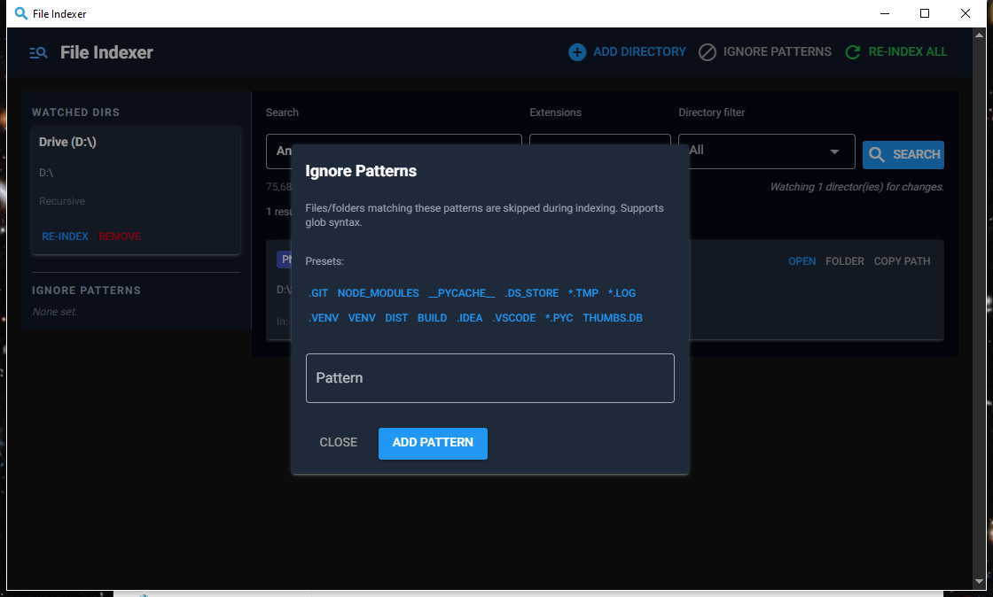 .git,node_modules,*.tmp). Preset buttons for common ones - Live monitoring — background watchdog observer tracks file creates, deletes, moves, and modifications and updates the index automatically